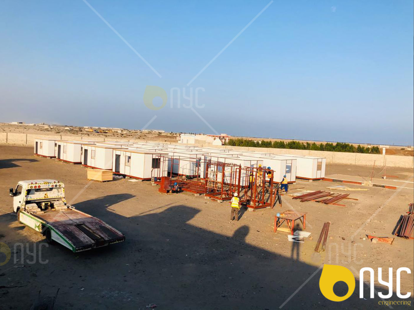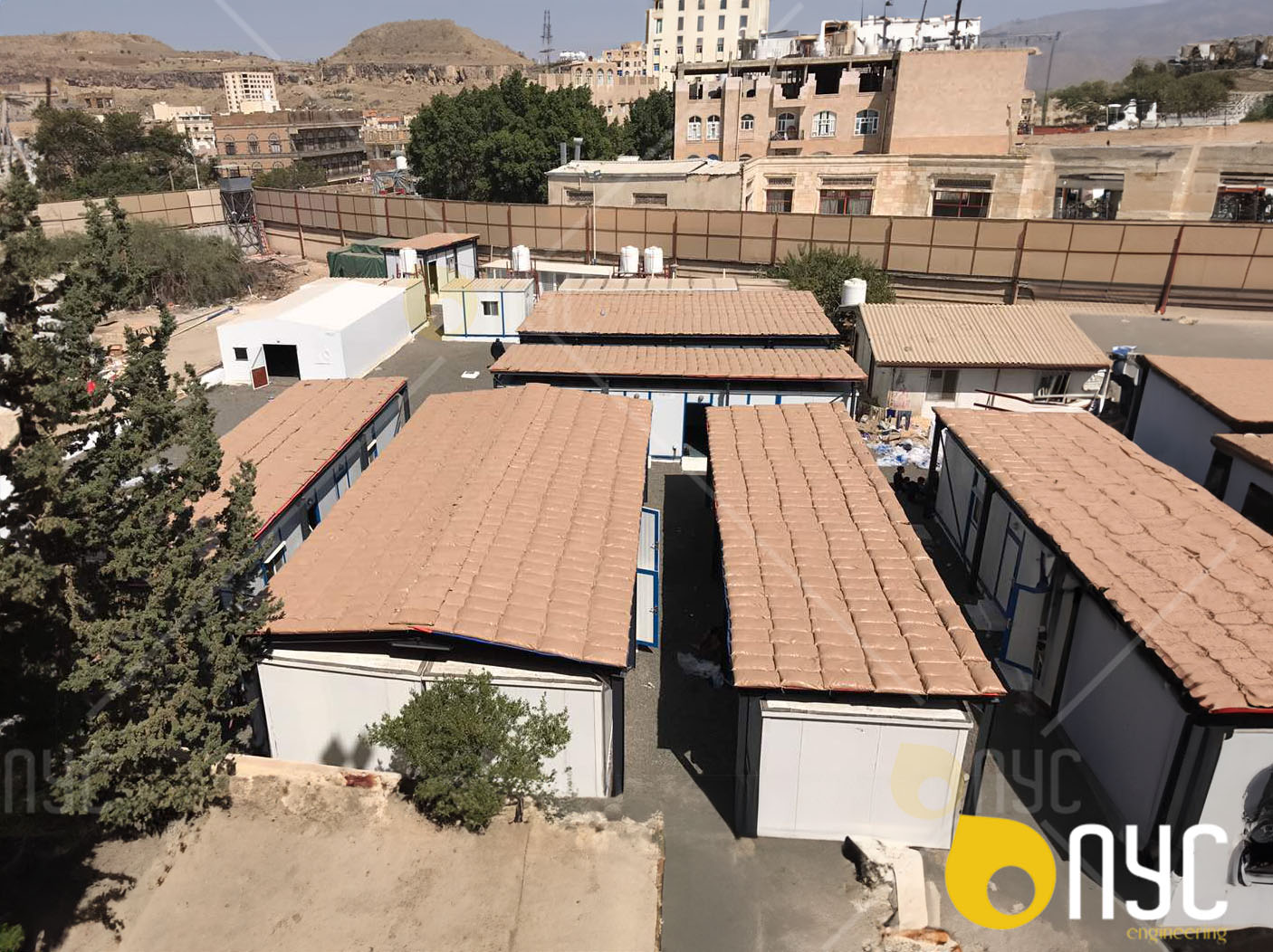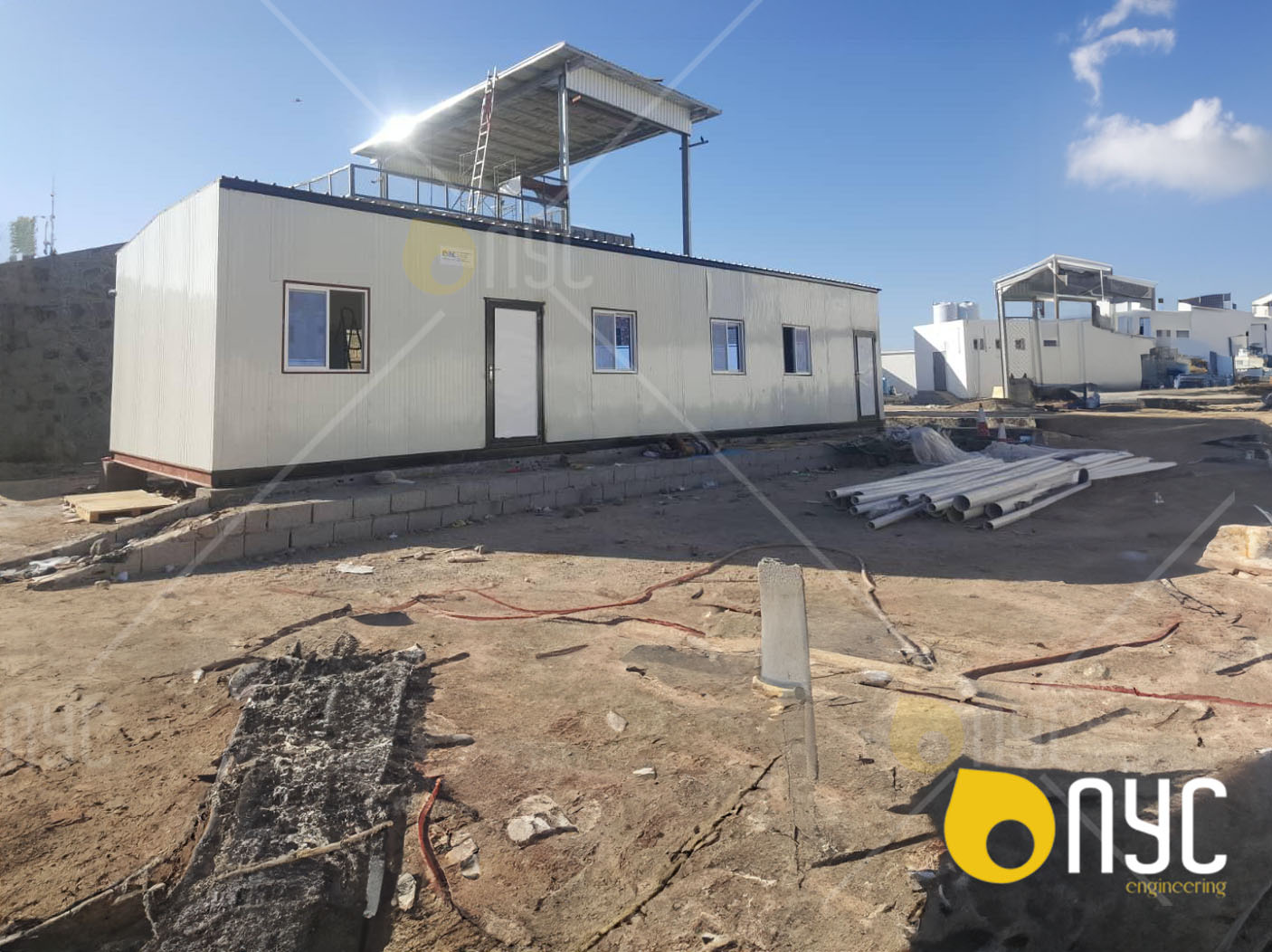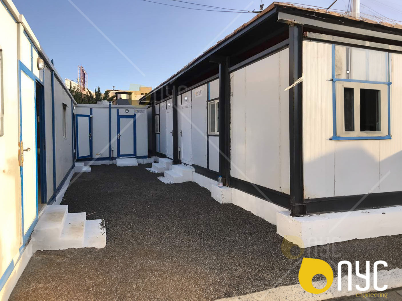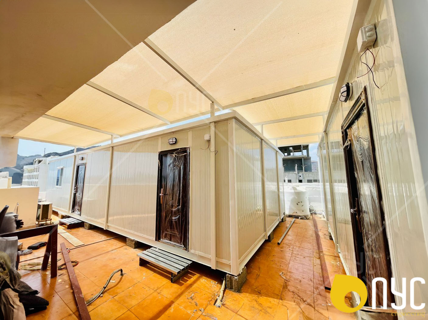 ViewMobile caravan offices with shade over the building