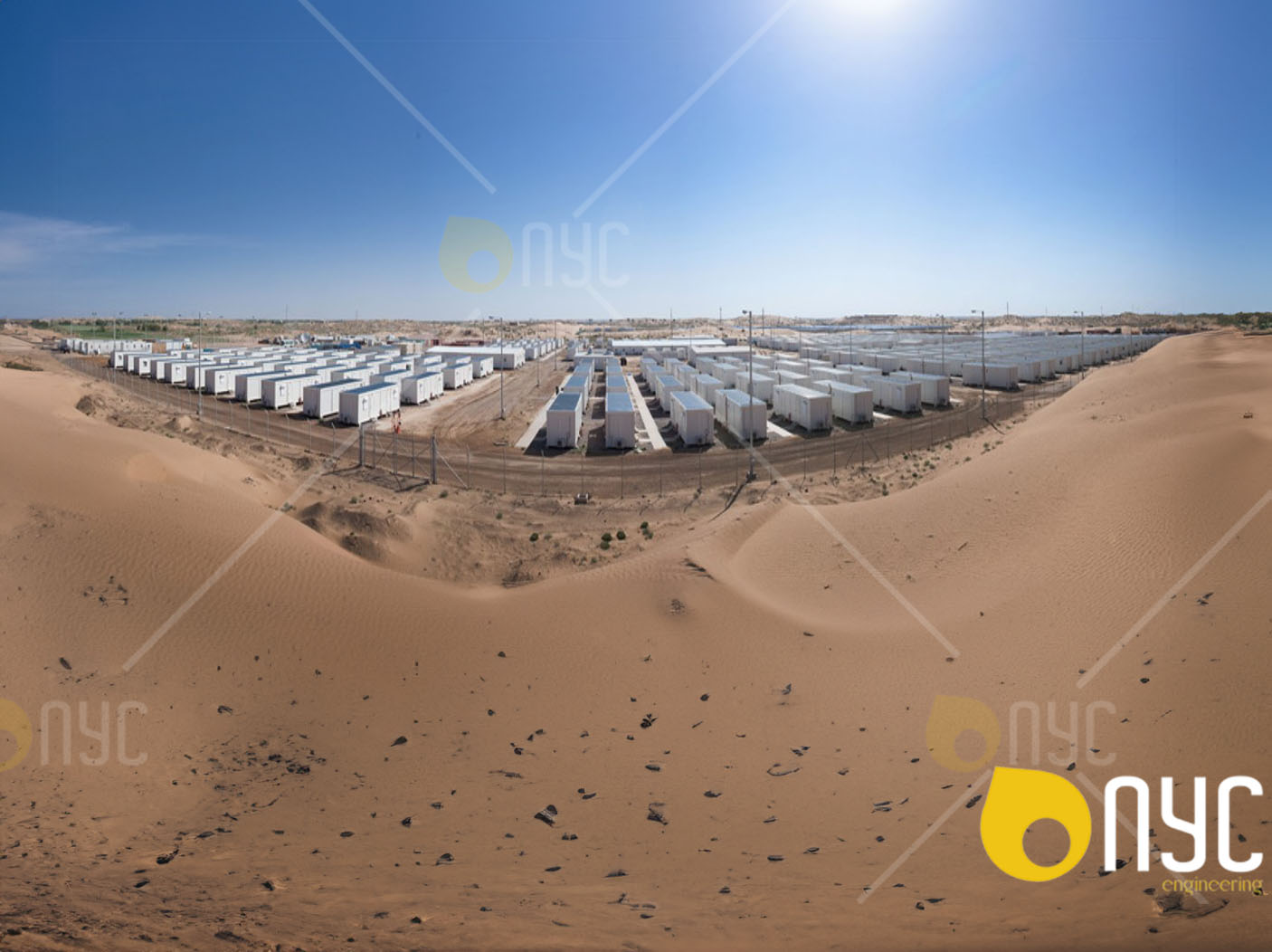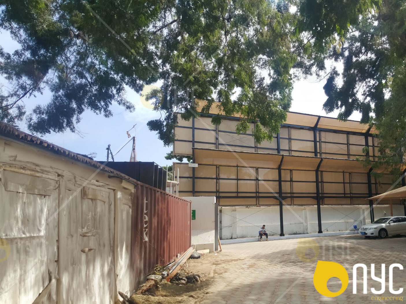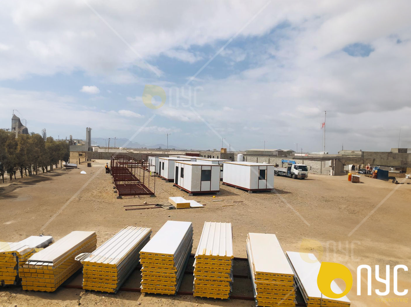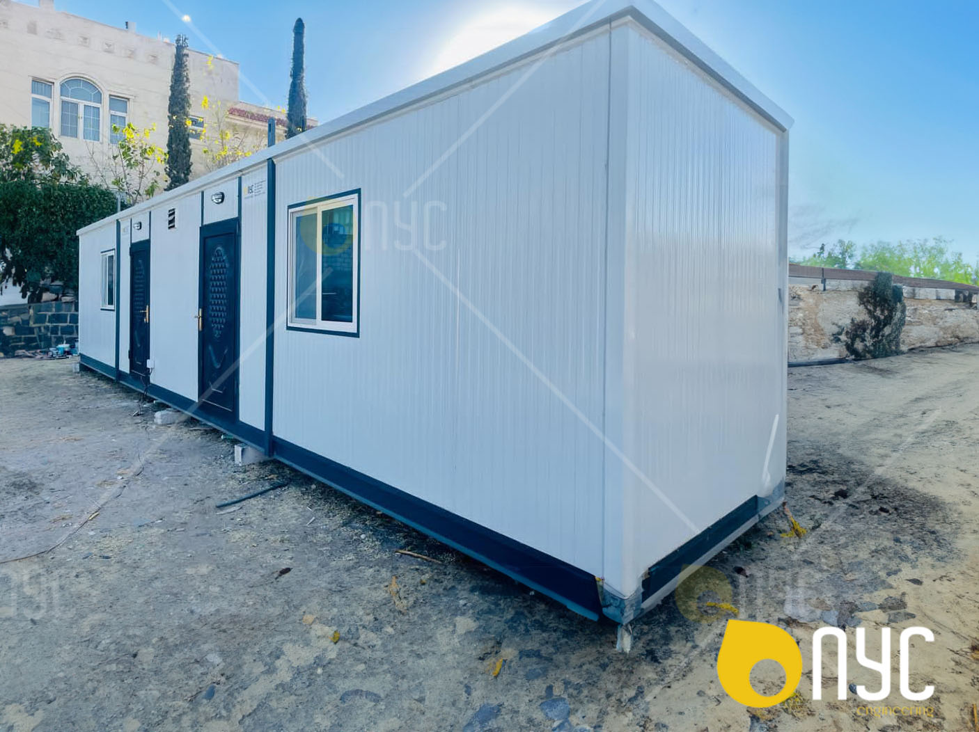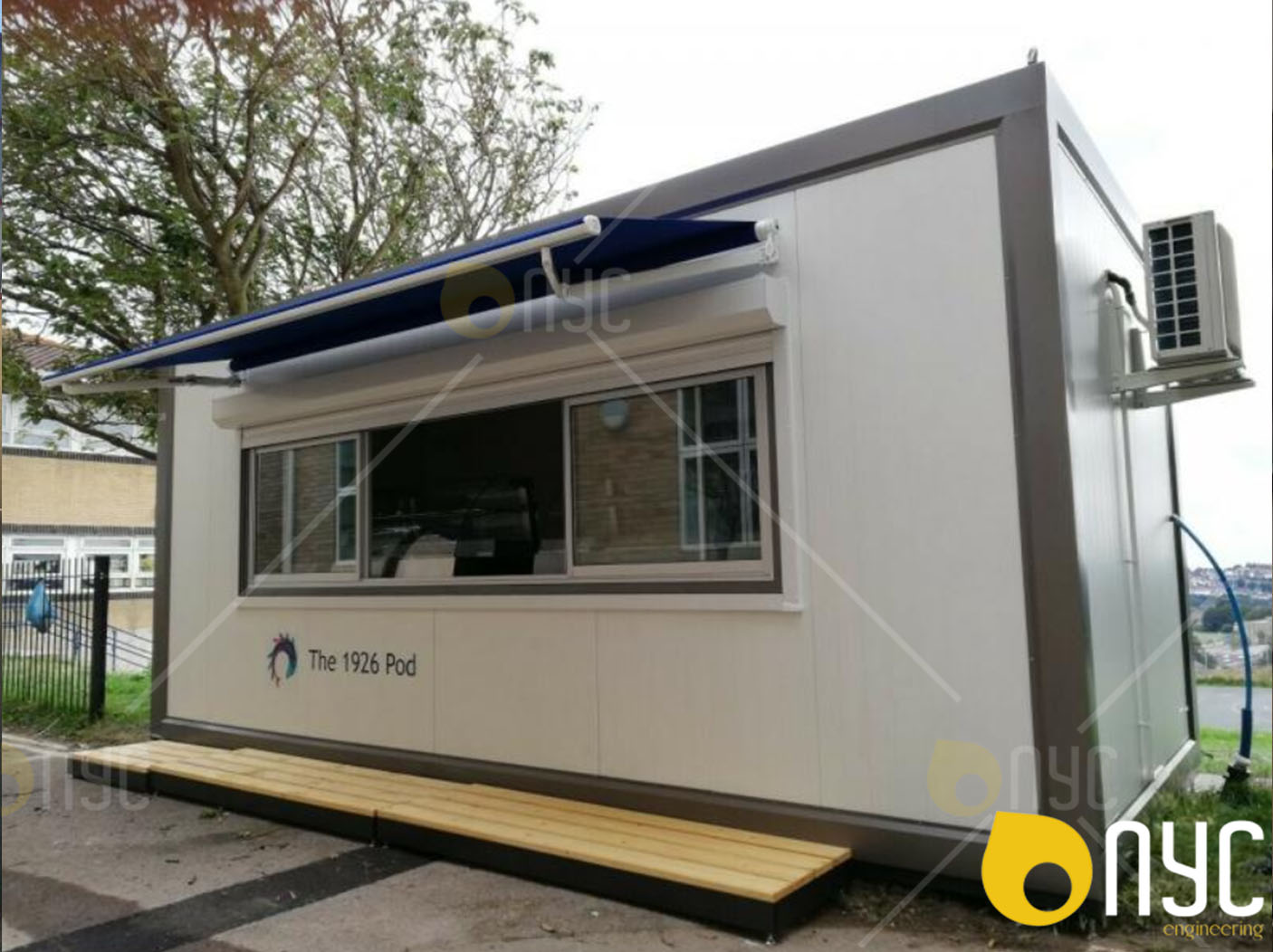 ViewMobile caravan offices with shade over the building